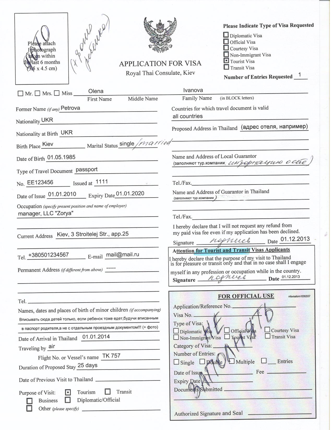 Туристична віза в Королівство Таїланд може бути одноразова або багаторазова. Термін розгляду заявки апліканта – 5 робочих днів. До обов’язкового списку документів, працівник консульства має право запросити додаткові документи, які він вважатиме необхідними.